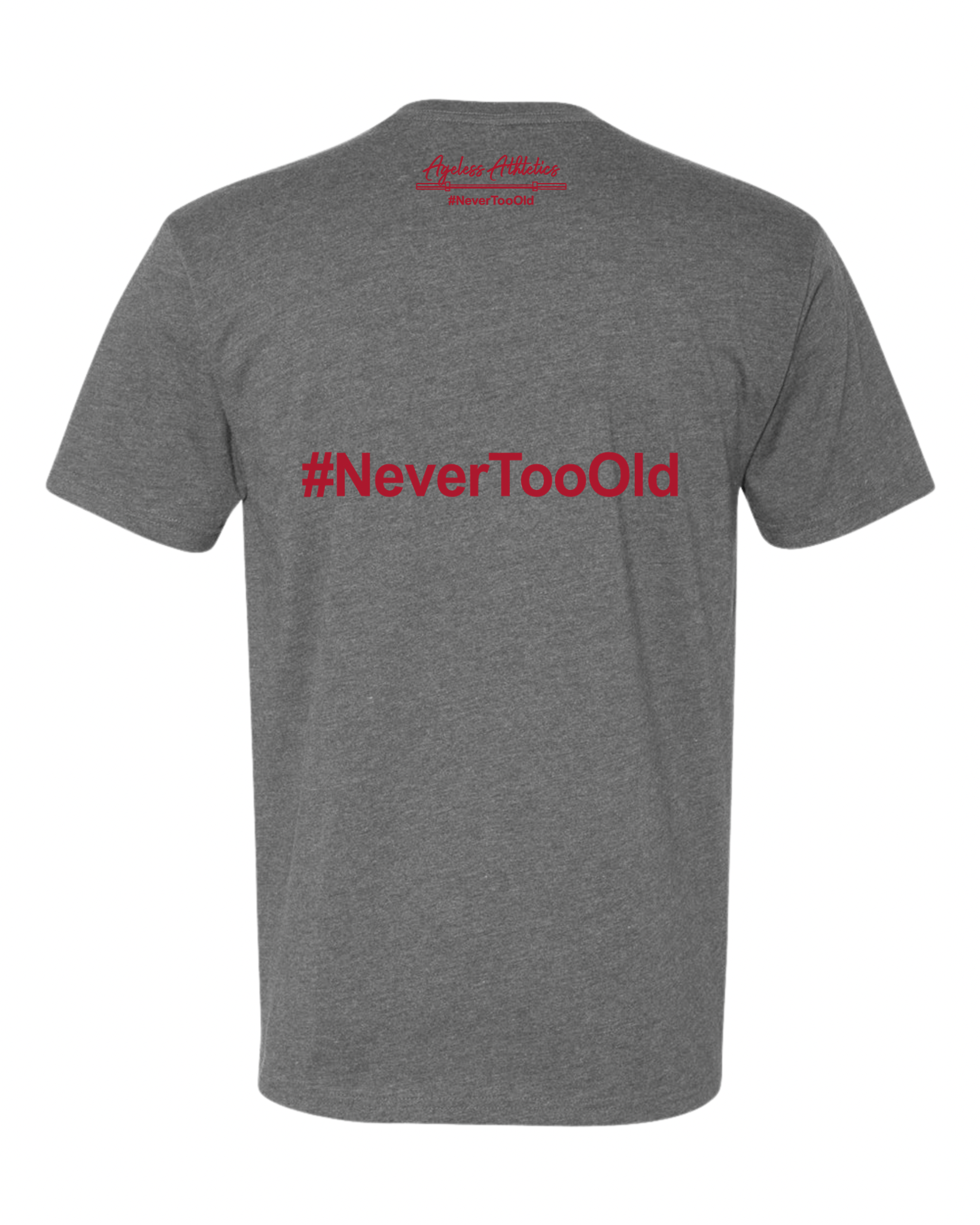 This ultra-soft heather gray shirt features our signature AGELESS logo in a playful candy cane swirl design, paired with the classic Athletics script on the front. The back proudly displays #NeverTooOld in striking red — a statement that speaks to every athlete who refuses to let age define their limits.