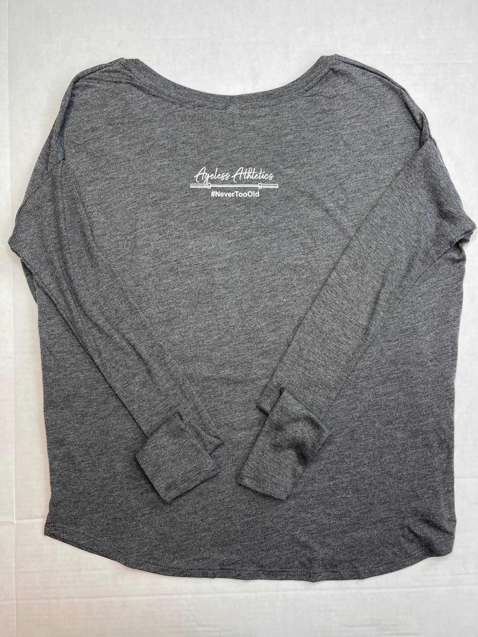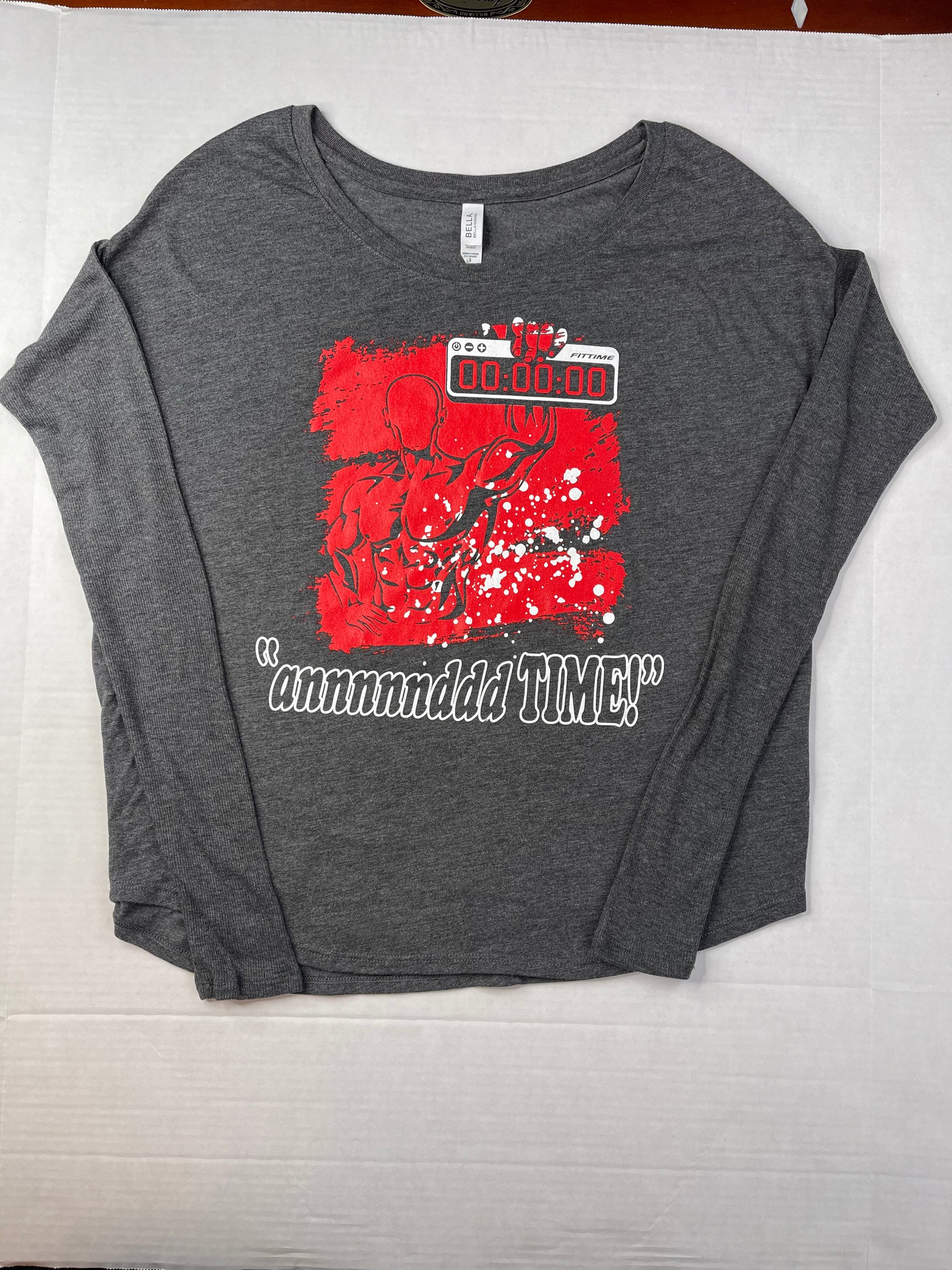 You asked, so we made one!  Girls!!! Finally, a long sleeve shirt by Ageless Athletics that is super soft, light weight material, and a FUN shirt.  The design is based on a friend (Hi Craig!) who always used to yell out "annnnd TIME!" right in the middle of the workout.  I couldn't help it, I laughed every time.  When he moved away, I had a shirt designed for him as a going away present, and the idea for this shirt was born.  Great for workouts, walking, piddling around the house...whatever you want to do.  This shirt is made with a wider neckline which is feminine, but the arms on this shirt show off your muscles, because it is ribbed with a stretchy fit.  The curved lines along the hips show off your best assets!  It fits true to size yet is loose enough to lounge in.  Ladies, if you have a love/hate relationship with WODS, then this shirt is made for you, because you know you can't wait for that timer to get to zero!